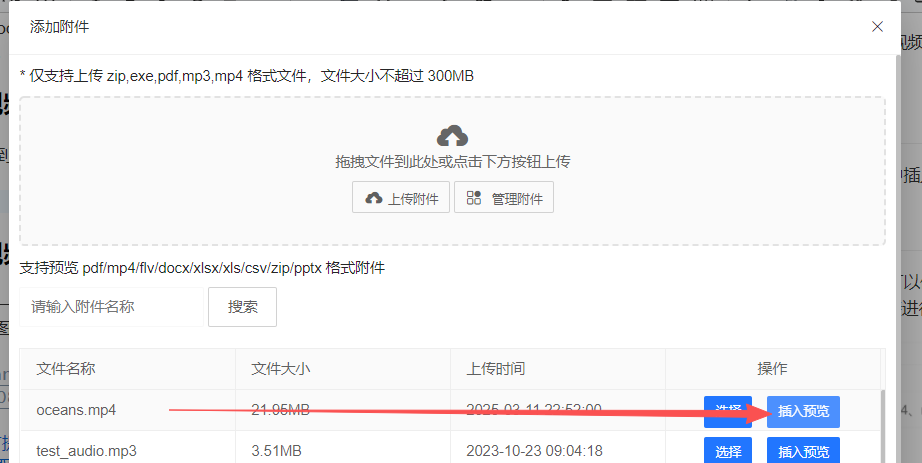 觅思文档(MrDoc)没有提供单独的视频对象功能,如果你需要在文档中插入视频,可以按照下面的方式来处理。 ## 插入预览视频文件附件 将视频文件上传到附件,然后在文档中插入此视频文件的「附件预览」:  ## 插入视频文件地址 如果你的视频是一个视频文件,那么可以使用这种方式,复制视频的URL链接,在文档编辑器中工具栏中点击视频图标,输入视频URL链接进行插入;  >i 觅思文档没有提供单独的视频上传入口,如果你需要上传和播放本地视频,需要先将视频上传为附件,然后获取视频附件的URL地址。 ## 插入视频网页地址 如果你的视频是一个网页,那么可以以插入`iframe`的方式在文档中显示和播放视频。